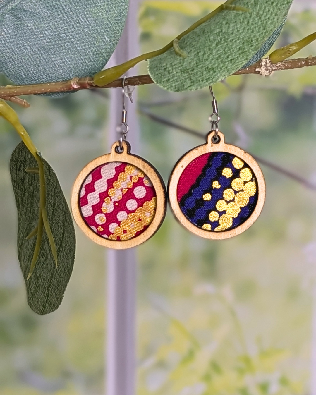 Elles associent du bois, découpé avec soin par Au bois d’Odile, et des chutes de tissus issues de mes créations cousues.