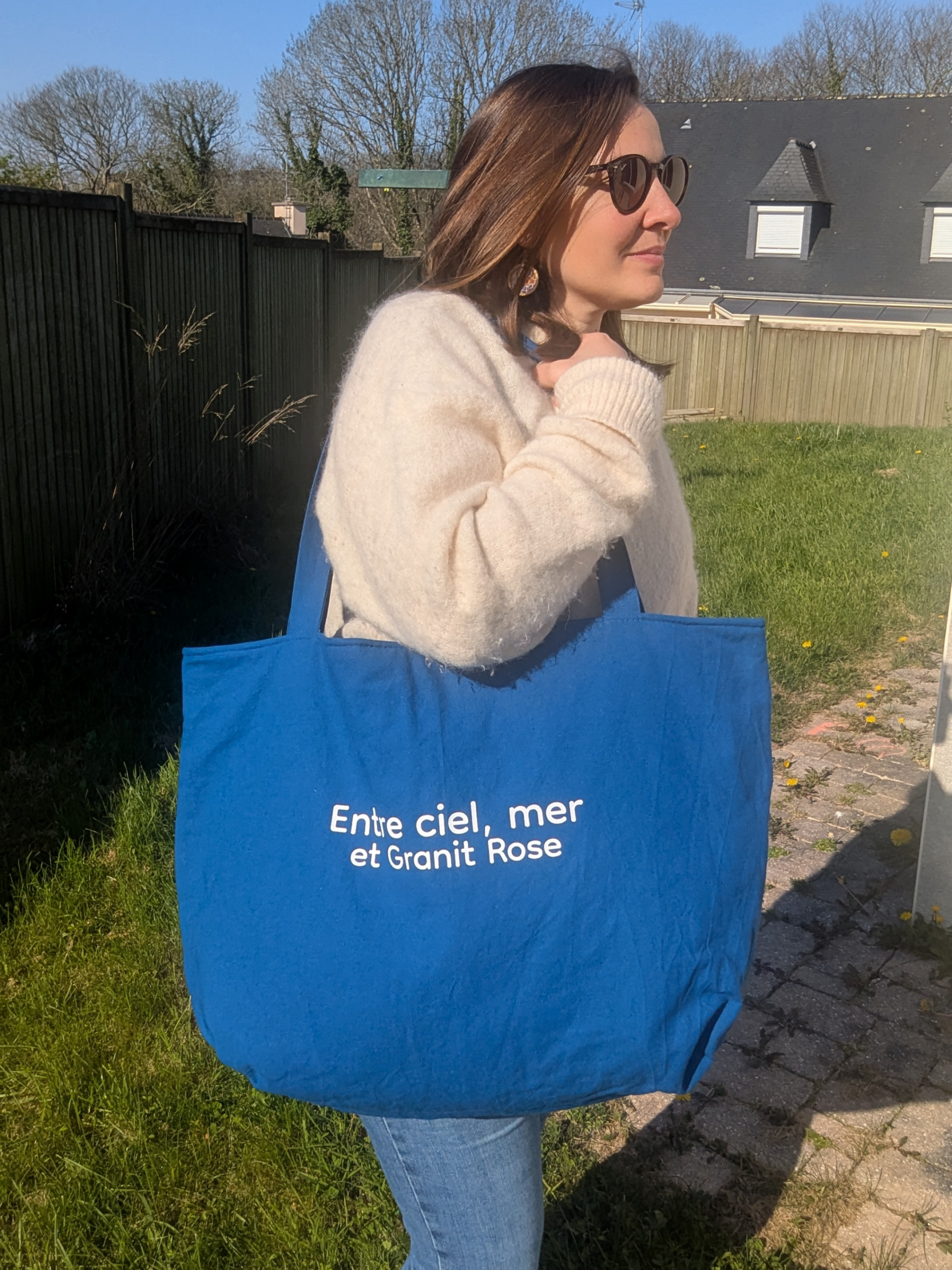 Composition : Un côté Coquillages matelassé (100% Coton) et un côté en coton (100% Coton) personnalisé avec la phrase : « Entre ciel, mer et granit rose ». Un sac 3-en-1.
